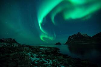 L'aurora boreale, o luce del Nord, nasce dall'incontro delle particelle elettriche emesse dal sole, note come vento solare, con la ionosfera terrestre. La ionizzazione della materia solare all'interno della nostra atmosfera genera i fasci di luce chiamate aurore. Nella foto, l'aurora boreale illumina il cielo di Reinfjorden a Reine, nelle isole Lofoten, Norvegia