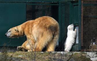 Stimolato da nuovi suoni e odori, il cucciolo di orso polare non lascia il fianco della madre, anche se i due non hanno trascorreranno molto tempo all'aperto per una questione di sicurezza -