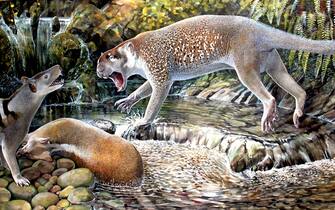 Viveva in Australia, nel tardo Oligocene, questo leone marsupiale ormai estinto, il Wakaleo schouteni, grande all'incirca come un cane husky, i cui resti fossili sono stati rinvenuti nel Queensland (Illustration credit: Peter Schouten) -