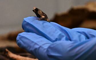 Una giovane rana cornuta malese nata nel 2018 è stata fotografata sulla punta del dito di un veterinario della struttura -