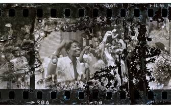 © Gideon Mendel, Prix Pictet - Scansionato e rilavorato dopo gravi danni causati da acqua e muffa, lo scatto mostra un momento di protesta in Sudafrica risalente agli anni Ottanta -