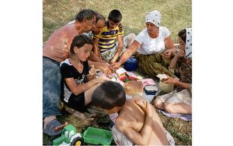 © Rena Effendi, Prix Pictet - La famiglia Borca si rilassa dopo una giornata di lavoro nei campi iniziata molto presto. La fotografia è stata scattata a Maramureş, nella parte romena della Transilvania settentrionale del 2012 -