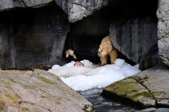 Dopo un inizio circospetto, il cucciolo di orso polare si è divertito giocando con la mamma sulla neve dello zoo
