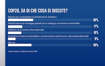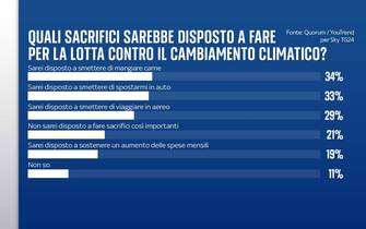 Il 61% ritiene insufficiente l’azione di contrasto all’emergenza climatica da parte dell’Italia, intesa come sistema Paese e non solo come governo Meloni. Due italiani su tre si dicono disposti a fare delle rinunce per migliorare il clima: il 34% direbbe addio alla carne nell’alimentazione, il 33% all’auto e il 29% all’aereo. Ma solo il 30% conosce i temi della Cop28. Il 47% è favorevole al ritorno del nucleare. È quanto emerge dall'ultimo sondaggio Quorum/YouTrend per Sky TG24