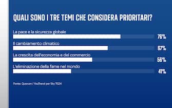 - Per due italiani su tre (67%) il cambiamento climatico è un tema prioritario tra le questioni internazionali, secondo solo alla pace e alla sicurezza globale (76%). Emerge dall’ultimo sondaggio realizzato da Quorum/YouTrend per Sky TG24. Poi ci sono la crescita dell’economia e del commercio (56%) e l’eliminazione della fame nel mondo (41%)