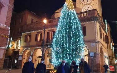Nonostante l'emergenza covid, la giunta guidata dal sindaco Giuseppe Pezzanesi non ha rinunciato alle sue luminarie, in accordo anche con la Pro loco Tct, Assm e commercianti. Ai piedi dell'albero è stato allestito anche un piccolo presepe. (ANSA).