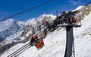 Sospesi a 100 metri di altezza, tra terra e cielo, per eseguire la manutenzione della Skyway Monte Bianco, il moderno impianto sul versante italiano del massiccio che conduce fino ai 3.462 metri di Punta Hellbronner. I lavori - documentati in una serie di immagini spettacolari - sono in corso in questi giorni per garantire un accurato mantenimento della struttura, prima dell'inizio dell'inverno e l'arrivo della neve.