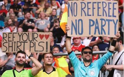 EURO 2024, fan impazziscono per le maglie arbitri Sport "Ref your shirt please", così era scritto su uno dei cartelloni durante la partita... 26 giu - 16:14