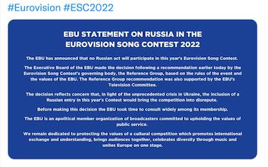 Guerra Ucraina-Russia, Mosca non potrà partecipare all’Eurovision Musica La decisione è stata presa alla luce di quanto sta accadendo in Ucraina, dove Mosca ha dato il... 25 feb - 18:33