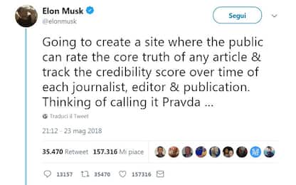 Elon Musk contro giornalisti: Sito per recensirli, lo chiamerei Pravda Mondo L'attacco ai media di Musk arriva dopo critiche agli incidenti delle Tesla e agli obiettivi di... 24 mag - 14:26