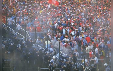 Supporters flee 29 May 1985 the scene of riots in Heysel football stadium in Brussels after thirty-nine Juventus football fans died during rioting at the European Cup Final in Brussels. Shortly before kick off the atmosphere turned violent and Liverpool supporters stampeded through a thin line of police towards the rival fans. As the Juventus fans retreated a wall collapsed under the pressure and fans were crushed and trampled to death in the panic. AFP PHOTO DOMINIQUE FAGET / AFP PHOTO / DOMINIQUE FAGET        (Photo credit should read DOMINIQUE FAGET/AFP via Getty Images)