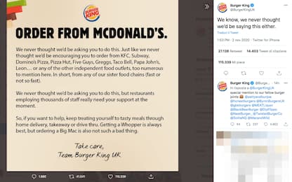 Covid, l’appello di Burger King su Twitter: “Ordinate da McDonald's” Mondo La catena di fast food in un post sui social invita i suoi clienti a servirsi anche delle aziende... 03 nov - 07:53