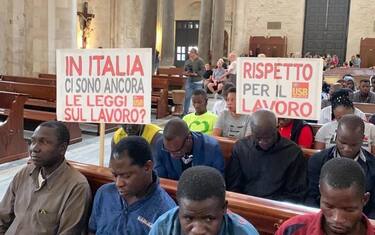 Una delegazione di braccianti della provincia di Foggia e del ghetto di Borgo Mezzanone ha occupato questa mattina simbolicamente la Basilica di Bari. L'iniziativa, organizzata da Coordinamento Lavoratori agricoli USB Foggia, "si inserisce - spiega una nota del sindacato a firma di Aboubakar Soumahoro - nel più ampio percorso di lotta dei braccianti che vivono nei ghetti del territorio foggiano". È "una lotta contro l'indifferenza della Regione Puglia e del Governo gialloverde - aggiunge - che cerca di trasformare una questione sociale in una questione di pubblica sicurezza. Nelle campagne del foggiano si continua con l'attacco alle 'baracche', per radere al suolo i campi dei braccianti senza una soluzione alternativa". I migranti in protesta hanno chiesto un incontro con l'arcivescovo di Bari, lamentando che "da troppo tempo si attendono risposte e l'avvio di un tavolo regionale sui temi dell'agricoltura e del bracciantato, si chiedono incontri alle istituzioni regionali, ma finora nulla si è fatto".