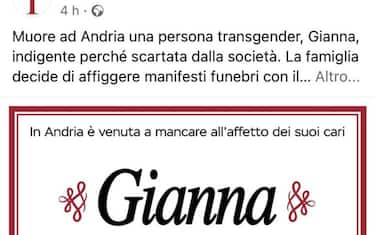 (ANSA) - BARI, 20 GEN - "Muore ad Andria una persona transgender, Gianna, indigente perché scartata dalla società. La famiglia decide di affiggere manifesti funebri con il suo nome al maschile. Un'offesa al nome e all'identità con cui la conoscevano tutti. Abbiamo deciso di rifare la locandina funebre per darle un rispettoso ultimo saluto". E' il messaggio dall'agenzia Taffo funeral services che su facebook ha pubblicato un manifesto funebre per restituire alla 49enne pugliese la sua identità, "Gianna" e non Giovanni come scritto sui manifesti affissi in città. L'agenzia funebre ha raccolto una segnalazione di Vladimir Luxuria, la quale ha commentato l'iniziativa come "un gesto di amore, di pietas, contro la damnatio memoriae di chi vorrebbe cancellare la sua identità, la restituzione della dignità di un essere umano. Gianna che non merita, dopo tutto quello che ha passato nella vita, di morire due volte".