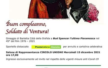 (ANSA) - BARI, 14 DIC - "Buon compleanno, Soldato di ventura!". E' l'omaggio di Barletta, città della Disfida, a Bud Spencer, l'ultimo Fieramosca sul grande schermo, nel 45esimo (1976-2021) del film "Il soldato di ventura". Per l'occasione sarà diffuso un annullo filatelico speciale con relativa cartolina celebrativa da parte di Poste Italiane. Sarà poi presentato il libro a fumetti sulla vita avventurosa di Bud Spencer da parte di ReNoir Comics, la prima biografia a fumetti, autorizzata dai figli Cristiana, Diamante e Giuseppe Pedersoli che ne hanno anche scritto la prefazione. Sarà proprio Giuseppe Pedersoli a ricevere il riconoscimento, una speciale targa di benemerenza, nell'incontro patrocinato dal Comune in programma domani, alle 17, nel salone di rappresentanza del Circolo Unione, organizzato dall'Archeoclub d'Italia Associazione di promozione sociale Canne della Battaglia Barletta.