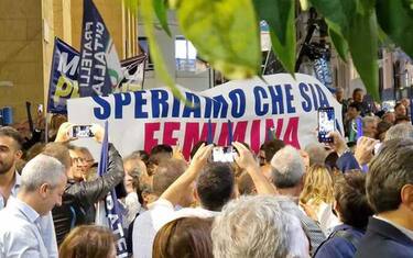 (ANSA) - BARI, 17 SET - "Speriamo che sia femmina". E' uno degli striscioni sollevati dal pubblico barese a sostegno di Giorgia Meloni durante un comizio nel centro della città. Frase che la leader di Fratelli d'Italia ha commentato dal palco dicendo: "bellissimo questo striscione". Salutando la piazza si è detta "pronta a guidare il governo se voi lo deciderete. Un governo di persone libere, orgogliose che amano l'Italia".