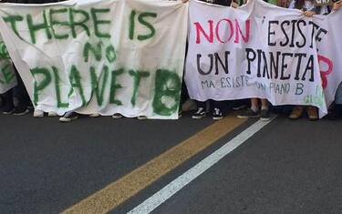 Giovani in marcia per vie città tra striscioni e cartelli