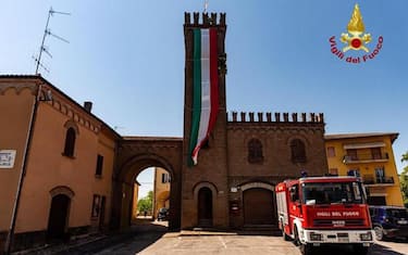 E' stato necessario l'intervento dei Vigili del fuoco per fissare una bandiera tricolore che ricopriva quasi interamente la Torre dell'Orologio nel centro di Casalfiumanese, comune del circondario imolese in provincia di Bologna.