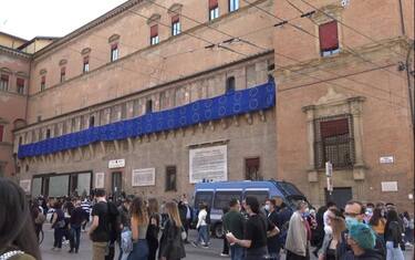 Una bandiera europea, lunga oltre 50 metri, stesa sulla facciata della Biblioteca Sala Borsa di Bologna per celebrare la festa dell'Europa in calendario domani.