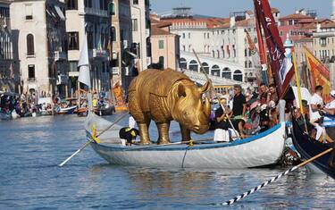 (ANSA) - VENEZIA, 05 SET - Una figura inaspettata, onirica, è comparsa oggi nella Regata Storica di Venezia,: una rinocerontessa d'oro, copia fedele della scultura di Valeriano Trebbiani che comparve nel film 'E la nave va' di Federico Fellini, e che ha stabile collocazione nella piazzetta San Martino di Rimini, accanto al nuovo Fellini Museum. Il rinoceronte femmina, lunga 4,5 metri, alta 2,5 metri, e pesante 200 kg , ha partecipato alla Regata storica, collocata su una 'bissona' di 12 metri, spinta da 4 vogatori, battente bandiera Fellini Museum.