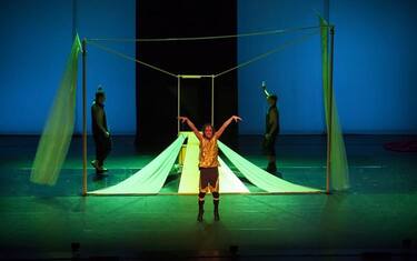 Bahamuth prende le mosse dal Manuale di zoologia fantastica di Jorge Luis Borges e Margarita Guerrero: un misterioso pesce legato alla mitologia babilonese che sostiene sulla propria schiena il mondo. Il lavoro di ideazione dello spazio scenico è durato due anni: in una scatola, un giocattolo di metallo, legno, stoffa verde e aria, un uomo trascorre l'agonia che lo porterà a una nuova vita fatta di rigurgiti tribali e storie passate, inquinate da problematiche contemporanee. In scena anche due giovani (Ivan Bellavista e Neilson Bispo Dos Santos), due elementi dinamici che mettono in moto le possibilità meccaniche della struttura: ruotano le ali leggere e svolazzanti che chiudono la scatola e si mostrano indaffarati intorno al "fardello uomo", entrano in scena rompendo la solitudine del protagonista e la staticità della scultura. Il susseguirsi delle vicende è una sorta di montaggio cinematografico, con una sequenza drammaturgica costruita mettendo in relazione i frammenti di storie con i movimenti e con i ritmi sonori della parola recitata in corsa. (ANSA).