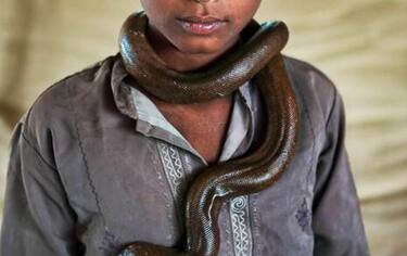 (ANSA) - BOLOGNA, 07 OTT - Con i suoi reportage in tutto il mondo ha spaziato nei generi più diversi, dalla guerra alla street photography e alla fotografia urbana, anche se il suo scatto più rappresentativo resta il ritratto della ragazza afgana: lo statunitense Steve McCurry, 72enne di Filadelfia, approda a Bologna con la mostra "Animals", allestita dall'8 ottobre al 12 febbraio prossimi nelle sale di Palazzo Belloni, nel cuore della città, curata da Biba Giacchetti per Next Exhibition. Il percorso si snoda attraverso 60 scatti che, mettendo in relazione l'essere umano e gli animali, raccontano al visitatore le storie di una vita quotidiana dove uomo e animale sono legati indissolubilmente. E, pur se raccontati, come è nel suo stile, in maniera gentile e poetica, con empatia e maestria nell'uso del colore, le foto, stampate dallo stesso Steve McCurry nel suo studio, contengono messaggi molto seri. "Un affresco corale dell'interazione e della condivisione - ha spiegato la curatrice - che tocca i temi del lavoro e del sostentamento che l'animale fornisce all'uomo, delle conseguenze dell'agire dell'uomo sulla fauna locale e globale, dell'affetto che l'essere umano riversa sul suo pet, qualunque esso sia". Animali da lavoro, usati come via alla sopravvivenza, animali talvolta sfruttati come unica risorsa a una condizione di miseria, altre volte amati e riconosciuti come compagni di vita per alleviare la tristezza o, semplicemente, per una forma di simbiotico affetto. Il progetto "Animals" è nato nel 1992 quando McCurry si recò nei territori di guerra nell'area del Golfo per documentare il disastroso impatto ambientale nei luoghi del conflitto. Tornò con alcune delle sue più celebri immagini, come i cammelli che attraversano i pozzi di petrolio in fiamme e gli uccelli migratori interamente cosparsi di petrolio, ma anche quella di un grande cane sul retro di una bici, o quella di una mamma con bimbo che dormono "protetti" da un serpente enorme, fino al ragazzino col serpente al collo come fosse una collana, che fa da manifesto per la mostra. (ANSA).