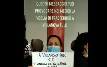 E, sistemate intorno a una colonna rossa, mostrano a turno i loro cartelli. Senza voce, annuiscono e commentano con gli occhi quello che c'è scritto. Obiettivo dichiarato: "Questo messaggio può provocare nei medici la voglia di trasferirsi a Villanova Tulo".