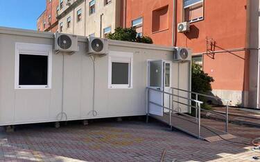 Via le tende da campo per il pre triage e l'isolamento all'ospedale "Dettori" di Tempio, sostituite da due container prefabbricati. Uno è stato installato all'ingresso del Pronto Soccorso per gestire gli accessi alla struttura: si tratta di un box di 15 metri quadri, completo di impianto elettrico ad uso medicale, climatizzazione, direttamente collegato alla camera calda dell'ospedale.