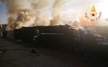 In fiamme una catasta di traversine in legno. Vvf all'opera