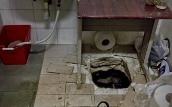 Un dettaglio del buco nel pavimento dell'ufficio postale di Napoli. I malviventi si sono aperti un passaggio dalle fogne fino alla superficie -