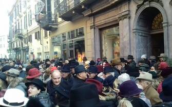 Centinaia di persone si sono ritrovate nella città piemontese davanti allo storico negozio di corso Roma, indossando il famoso copricapo, per chiedere il salvataggio dell'azienda, recentemente dichiarata fallita. Il sindaco: "Orgoglioso di questa rivendicazione"