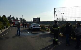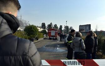 L'esterno del kartodromo di Rozzano presidiato dai vigili del fuoco dopo lo scoppio che ha ferito tre persone, che adesso si trovano in ospedale -