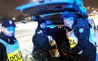 I due cani, coperti di neve e infreddoliti, sono stati soccorsi dai poliziotti, che li hanno accolti sulla loro volante prima di riportarli a casa (Polizia di Stato) -