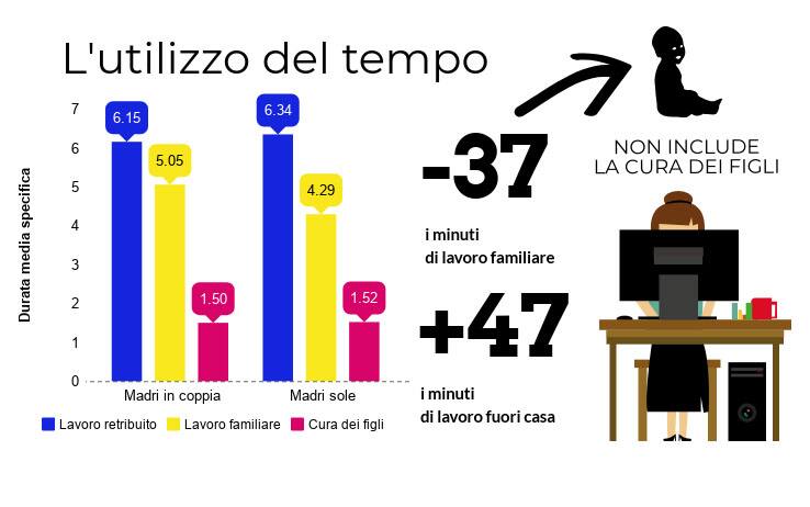 Bollette e spese impreviste a parte, il livello di soddisfazione generale delle donne sole è però secondo Istat piuttosto alto: l’88,5% delle madri sole si dichiara soddisfatta della propria condizione di salute, l’84,5% delle relazioni familiari, l’83,5% di quelle amicali. Più bassa la quota di soddisfatte per il tempo libero, che si riduce a poco più della metà, anche se in termini di quantità le madri sole ne hanno all’incirca quanto ne hanno le madri di minori che vivono in coppia (2 ore e 44 minuti al giorno).