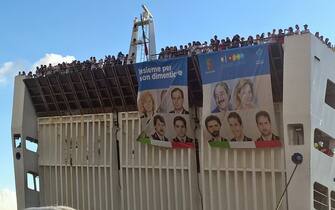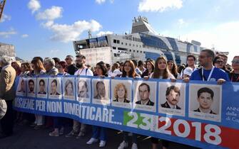 I ragazzi sono scesi dalla nave srotolando un manifesto con i volti e i nomi delle vittime delle stragi di Capaci e via d'Amelio. Durante il viaggio, iniziato la sera precedente da Civitavecchia, gli studenti hanno incontrato Claudia Loi, sorella dell'agente delle scorta Emanuela, e l'ex presidente del Senato Pietro Grasso (foto di Raffaella Daino) -