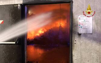 Un vigile del fuoco impegnato nelle operazioni di spegnimento: non è stato possibile entrare dentro al deposito a causa delle fiamme