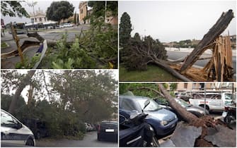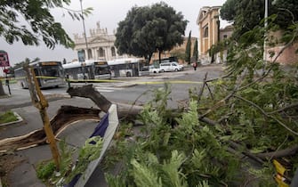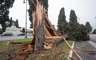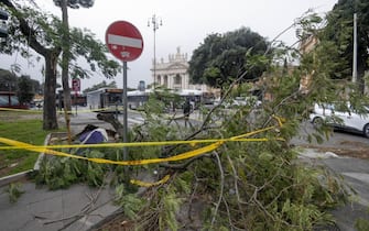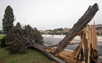 L'assessore alla sostenibilità ambientale di Roma Pinuccia Montanari ha definito quella che sta colpendo la Capitale "un evento straordinario, con vento a tempesta che ha raggiunto raffiche anche di 105 km orari, che sta causando danni sul verde urbano a Roma". Nella foto, un albero caduto al Circo Massimo -