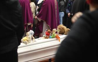 Sulla bara bianca della piccola Rachele, la più giovane delle vittime, sono stati sistemati dei peluches -