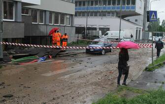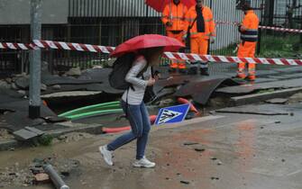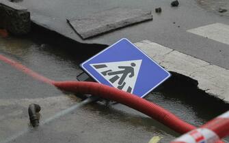 La crepa nella tubatura ha riversato una violenta ondata d'acqua, che ha creato una grande falla nella carreggiata