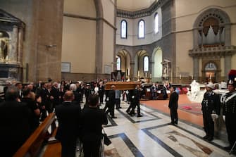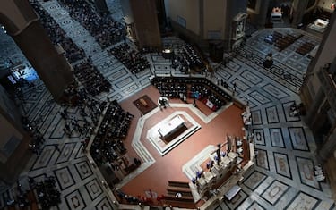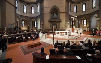 Il feretro di Franco Zeffirelli sull'altare del Duomo di Firenze, prima dell'inizio delle celebrazioni del funerale. Le esequie sono presiedute dall’arcivescovo, il cardinale Giuseppe Betori