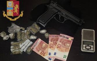 Il bottino ritrovato nel dizionario: 9 dosi di marijuana e un bilancino di precisione. E’ stata inoltre ritrovata e sequestrata la riproduzione di una pistola, senza tappo rosso (foto Facebook Polizia di Stato)