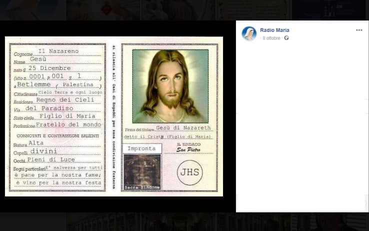 Cognome: "Il Nazareno"; nome: "Gesù"; nato il: 25 dicembre; professione: "Fratello del mondo". Appare così l'insolita carta di identità pubblicata dall'account Facebook di Radio Maria. Insolita perché - come è facilmente intuibile dall'immagine - è riferita appunto a Gesù. Nella carta di identità, accanto alla voce capelli, si legge "divini", mentre "pieni di luce" è la descrizione relativa agli occhi.