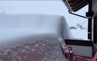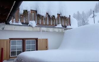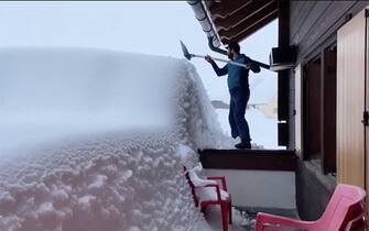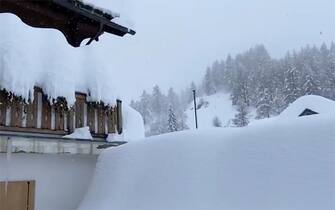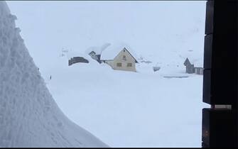 Oltre due metri e mezzo di neve in alcune località alpine di Piemonte e Valle D’Aosta, colpite da forti nevicate nei giorni scorsi. Nella foto, Riale, in Alta Val Formazza (Provincia del Verbano-Cusio-Ossola) dove sono caduti oltre due metri a 1800 metri di quota (Fotogramma del video pubblicato sulla pagina Facebook Meteo Piemonte)