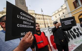 Manifestazione davanti a Montecitorio dei comitati 'No Grandi Navi' e 'No Mose', giunti questa mattina con un bus a Roma. I manifestanti hanno rivolto un appello al Governo per abbandonare il Mose e vietare il transito delle grandi navi in Laguna. LA FOTOGALLERY