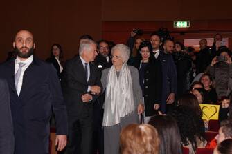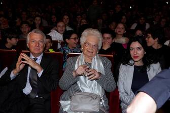 Liliana Segre ha parlato ai duemila studenti presenti al Teatro degli Arcimboldi di Milano in occasione di un evento dedicato alla Giornata della memoria. Nella foto Ferruccio De Bortoli, Liliana Segre e la ministra dell'Istruzione, Lucia Azzolina