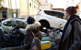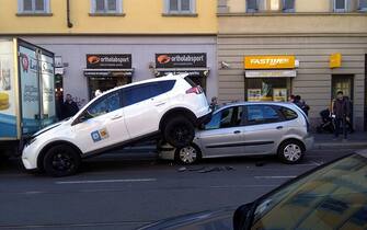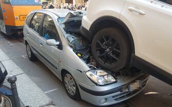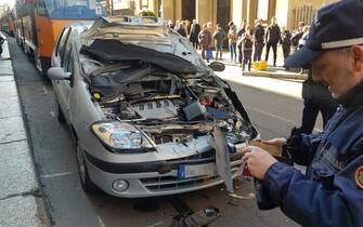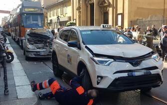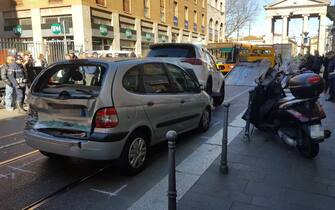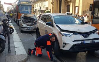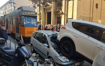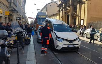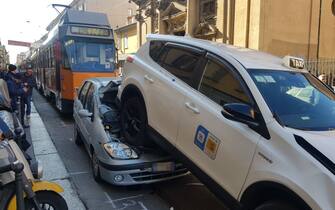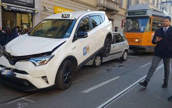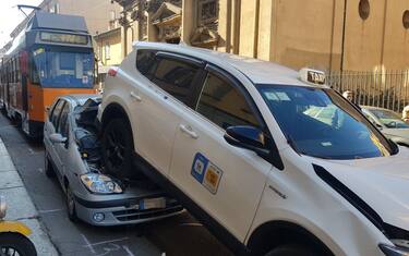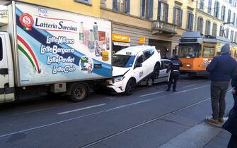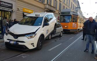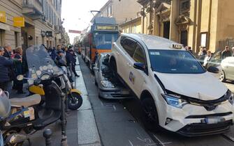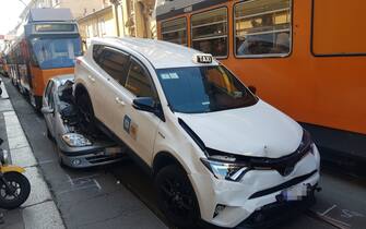 Maxi tamponamento a catena a Milano, in corso San Gottardo, tra un tram, una macchina, un taxi e un camion