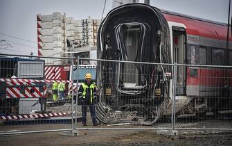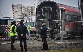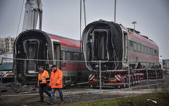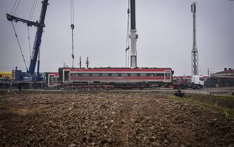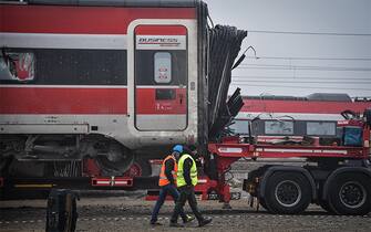 Prosegue il lavoro degli operai per liberare i binari dell’Alta velocità dai vagoni coinvolti nell’incidente dello scorso 6 febbraio a Ospedaletto Lodigiano