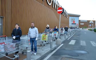 Orari ridotti, sistemi di spesa a domicilio in tilt e ingressi controllati. Lunghe code si sono formate fuori dai supermercati di varie città italiane, nonostante i negozi di alimentari siano regolarmente aperti e le scorte garantite, con alcune persone che hanno iniziato a mettersi in fila intorno alle 6.30 del mattino. Nella foto un supermercato a Prati Fiscali, Roma