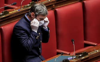 Il premier ha parlato dai banchi del governo, ben distanziato da sette ministri: nessuno di loro indossava mascherina e guanti