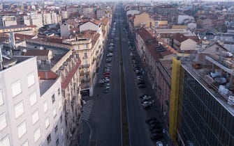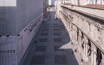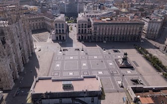 L’emergenza coronavirus ha imposto restrizioni in tutta Italia e le città si sono completamente svuotate. Un quadro complessivo ben visibile dall’alto. Un drone ha immortalato le piazze e le vie di Milano in una giornata di fine settimana in piena pandemia Covid-19. Strade deserte, pochissime macchine e persone in giro (Piazza del Duomo - Museo del Novecento)